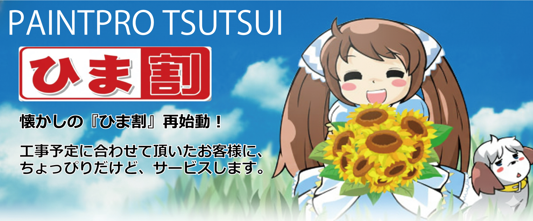 良い工事をするにあたって、よりベストな環境で作業をする、その分、工事のクオリティや、品質に対しての費用対効果、つまりは「コスパの良い塗替え」を、 筒井塗装が皆様にご提供できればと考えております。 この「ひま割」工事のご予約を承るという形をとらせて頂いております。